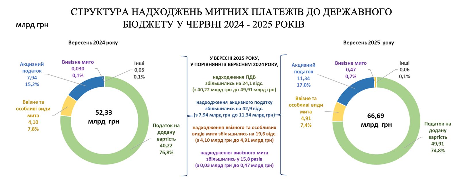 Традиційно, близько 75% надходжень митних платежів складає податок на додану вартість з ввезених товарів, надходження якого до бюджету збільшились на 24,1 % (з 40,22 млрд грн у вересні 2024 року до 49,91 млрд грн у вересні 2025 року).