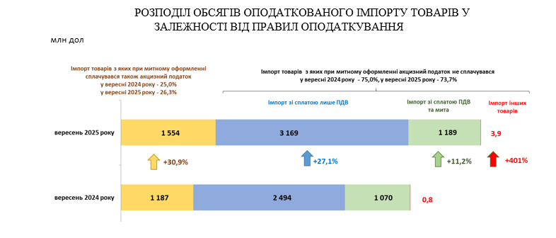 Порівнюючи з надходженнями ПДВ з вироблених в Україні товарів (робіт, послуг), у вересні поточного року суб’єкти зовнішньоекономічної діяльності та громадяни при імпорті товарів сплатили ПДВ на 24,3%  або на 9,77 млрд грн більше, ніж сплачено ПДВ з реалізації товарів (послуг) на митній території України (у вересні 2025 року зібрано 40,14 млрд грн ПДВ з вироблених в Україні товарів (робіт, послуг)).