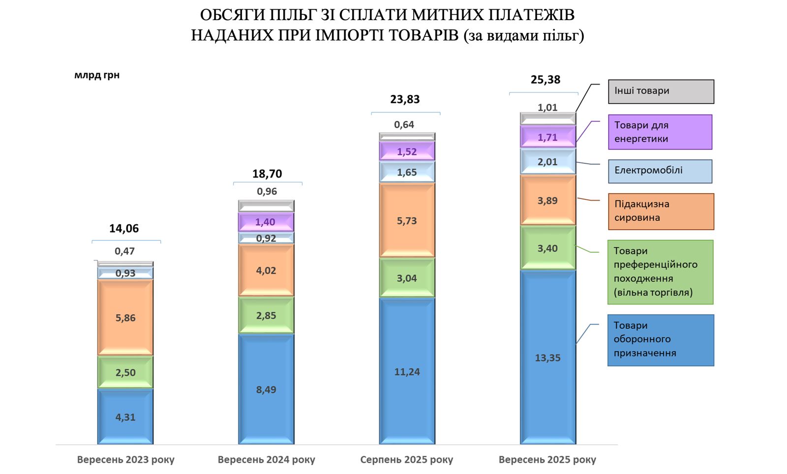 Таким чином, за рахунок зростання пільг при імпорті електромобілів (+1,09 млрд грн) та товарів для енергетики (+0,25 млрд грн), зниження цін на зазначені вище товари (0,51 млрд грн) та відставання фактичного валютного курсу від «бюджетного», у вересні 2025 року розрахункові недонадходження митних платежів до бюджету склали 7,79 млрд гривень.