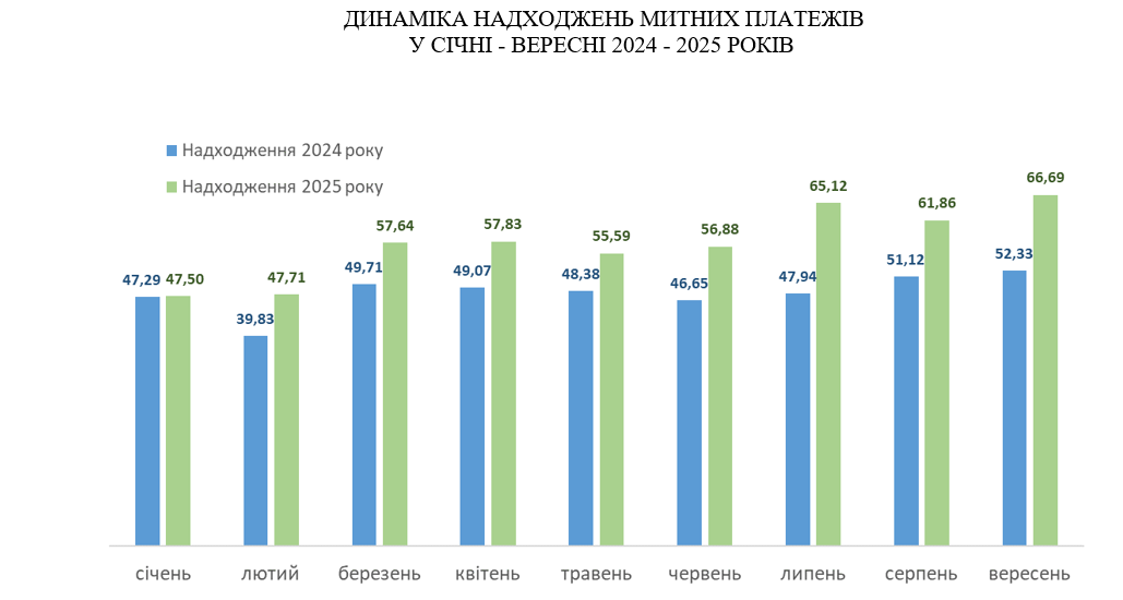 За результатами роботи у вересні  2025 року в структурі надходжень загального фонду державного бюджету (сальдо, без трансфертів) надходження митних платежів склали 43,5 % або 66,69 млрд гривень. У порівнянні з вереснем 2024 року надходження митних платежів, демонструючи помісячну тенденцію до зростання,  зросли на 14,35 млрд грн або на 27,4 %.
