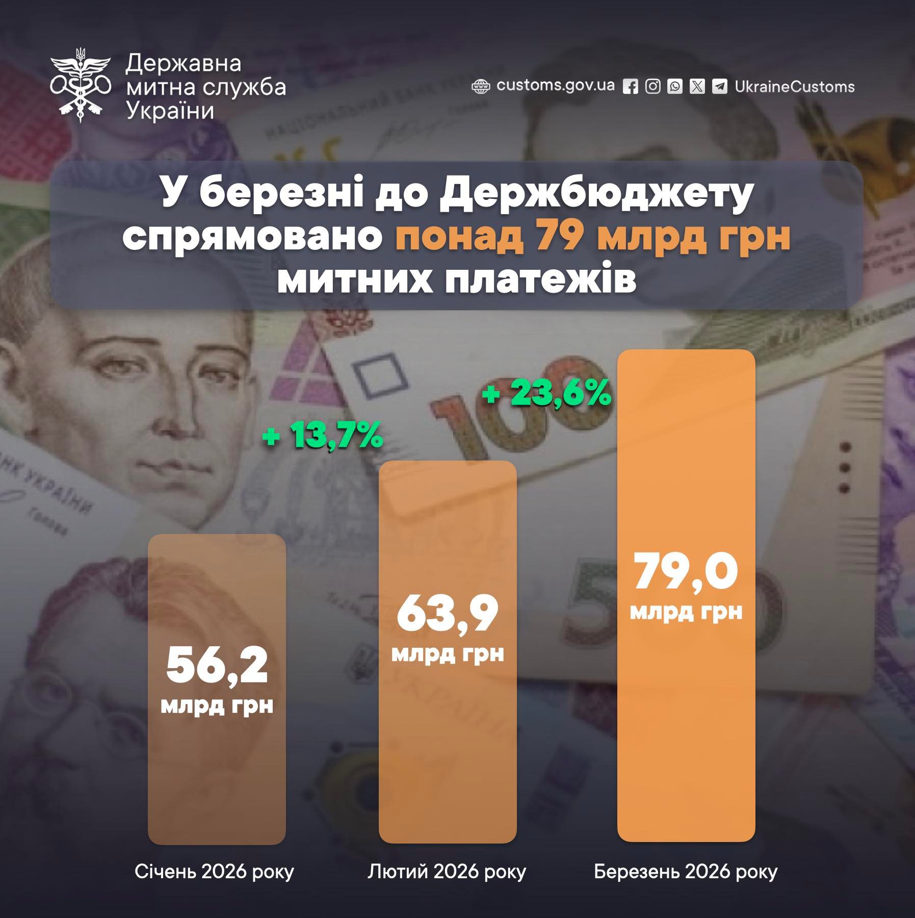 За результатами роботи у березні 2026 року Державна митна служба України спрямувала до бюджету понад 79 млрд грн митних платежів, що на 21,4 млрд грн перевищує результат березня 2025 року та на 15,1 млрд грн більше за показник минулого місяця.