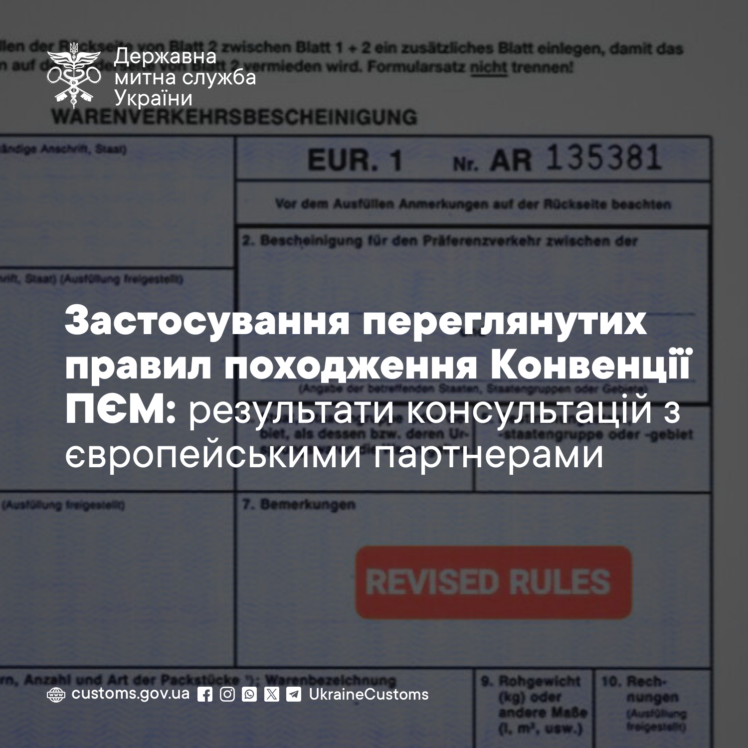 За інформацією європейських партнерів та з урахуванням вимог статті 28 Доповнення I до переглянутої Конвенції ПЄМ, докази преференційного походження, видані в державах Європейського Союзу після 01 січня 2026 року із записом «REVISED RULES» вважаються такими, що не впливають на заявлене преференційне походження відповідно до переглянутої Конвенції ПЄМ та приймаються для застосування преференційного режиму.