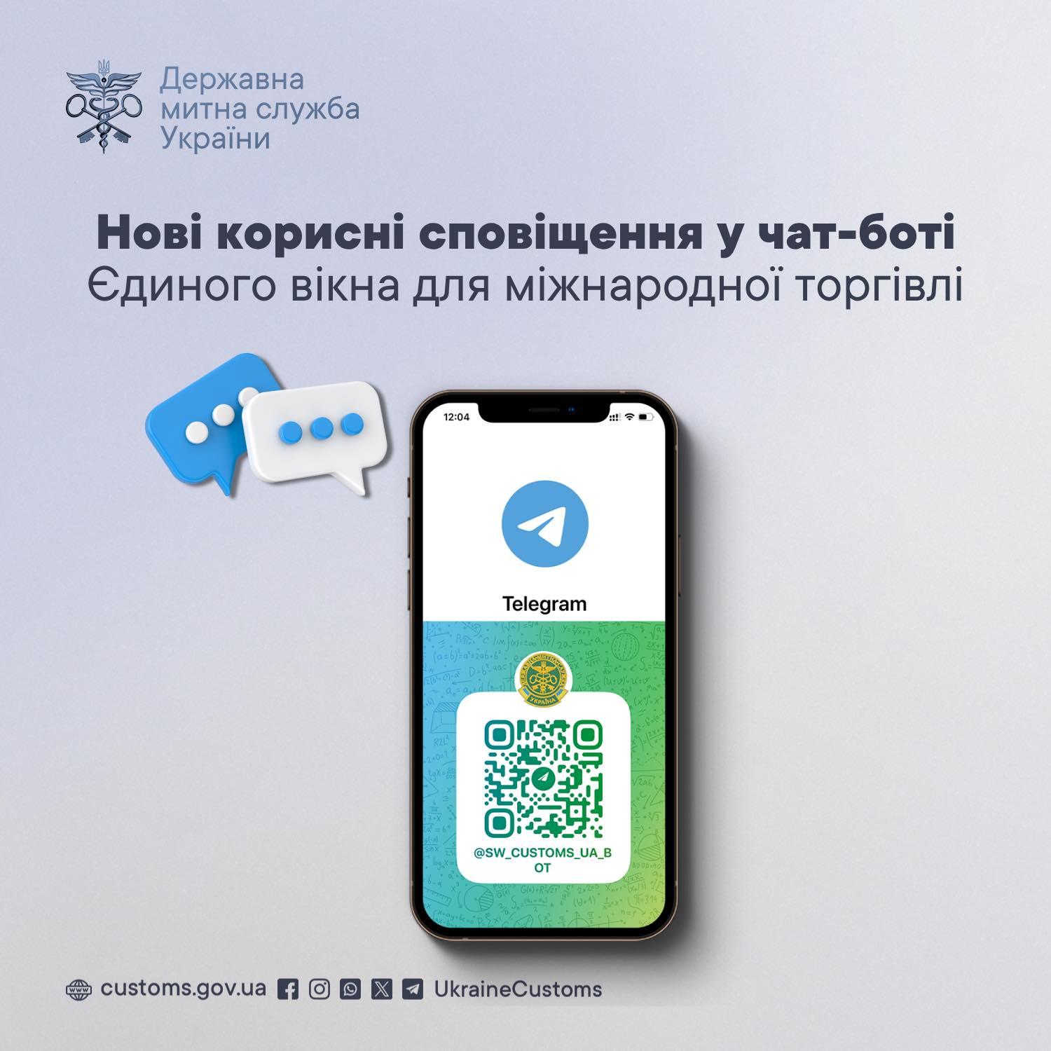 Відтепер чат-бот Державної митної служби України забезпечує можливість отримання сповіщень щодо оформлення, відмови в оформленні, перетину митного кордону та прибуття до митниці призначення за деклараціями, що оформлюються в міжнародній транзитній системі NCTS та оформлені або подані в Україні.