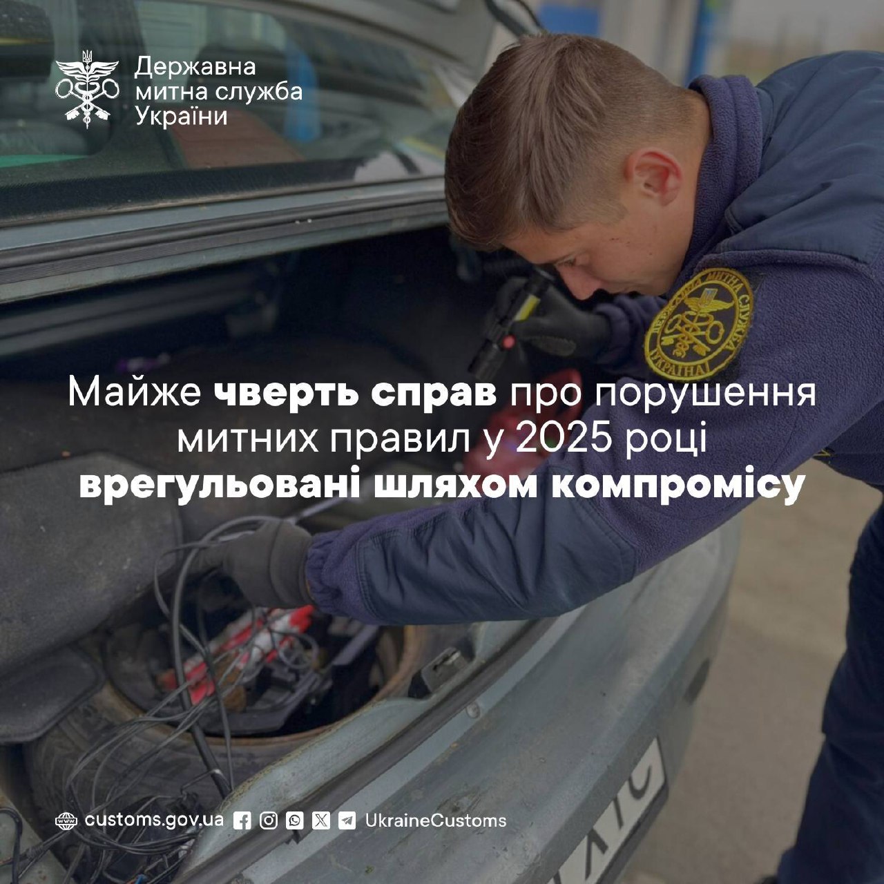Упродовж 2025 року митницями Держмитслужби було зафіксовано 9 507 фактів порушень митних правил, з яких 2 316 справ, тобто майже кожна четверта, були врегульовані шляхом компромісу. Для порівняння, у 2024 році було укладено 1 649 мирових угод. Водночас, у результаті вирішення цих справ, суттєво зросла й сума надходжень до державного бюджету: з 69,8 млн грн у 2024 році до 133,5 млн грн у 2025 році.