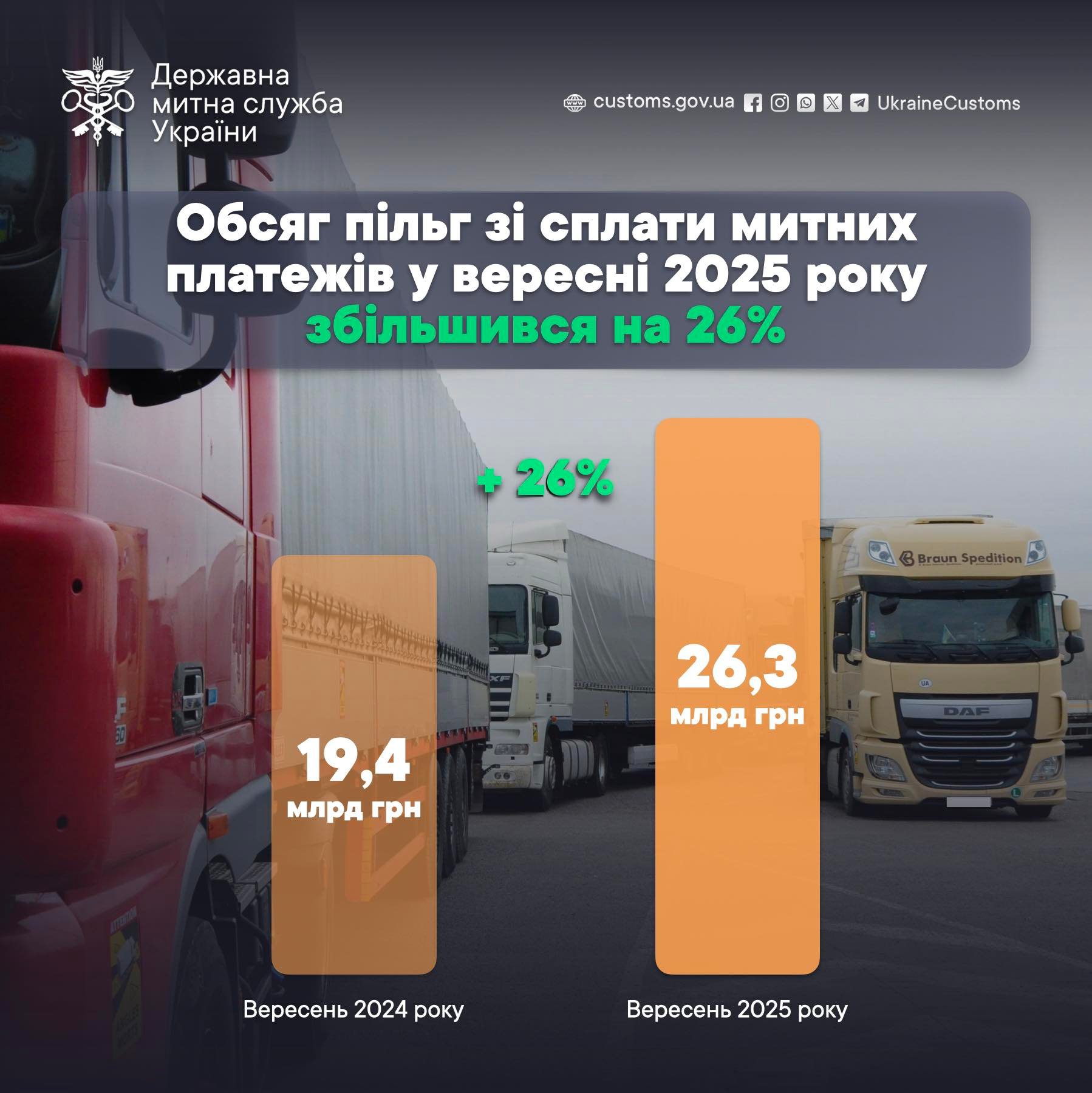 У вересні 2025 року до державного бюджету перераховано 66,7 млрд грн митних платежів. Водночас, при митному оформленні імпорту товарів надано пільг зі сплати митних платежів на суму 26,3 млрд грн – це 39,4% від суми надходжень до бюджету.